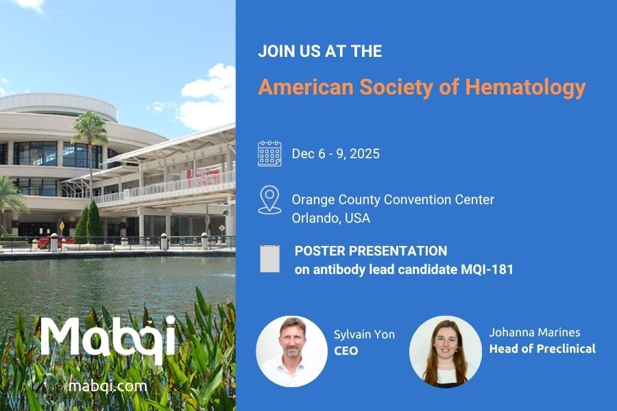As part of the scientific program, Johanna Marines, PharmD, Head of the Preclinical Team at Mabqi, will present the latest preclinical in vivo results of MQI-181, our novel pH-sensitive ADC for hematology-oncology during the poster session.